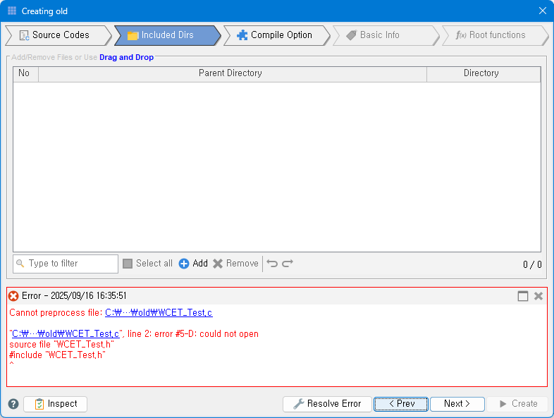 In the Included Dirs tab, click Resolve Error button.