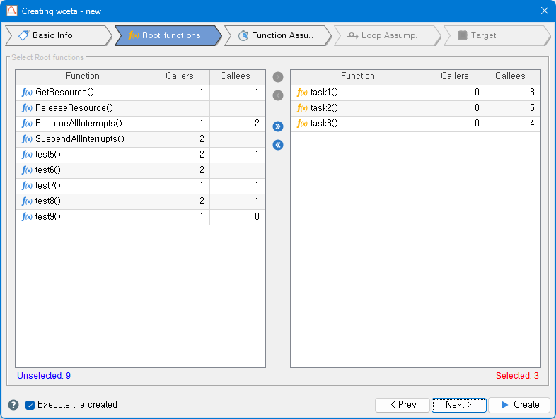 (WCET) in the result view, the results for the root function and sub-functions are displayed,